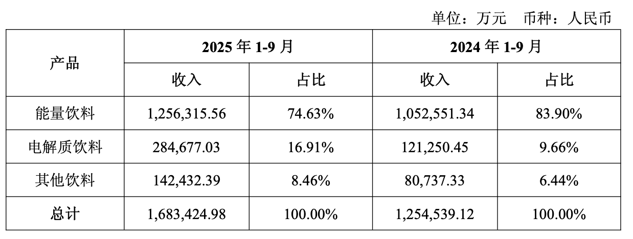 分产品来看,2025年1-9月,公司主营业务收入主要来自能量饮料,能量饮料收入占比为74.63%;电解质饮料收入占比由上年9.66%提升至本年16.91%,其他饮料合计收入占比为8.46%。