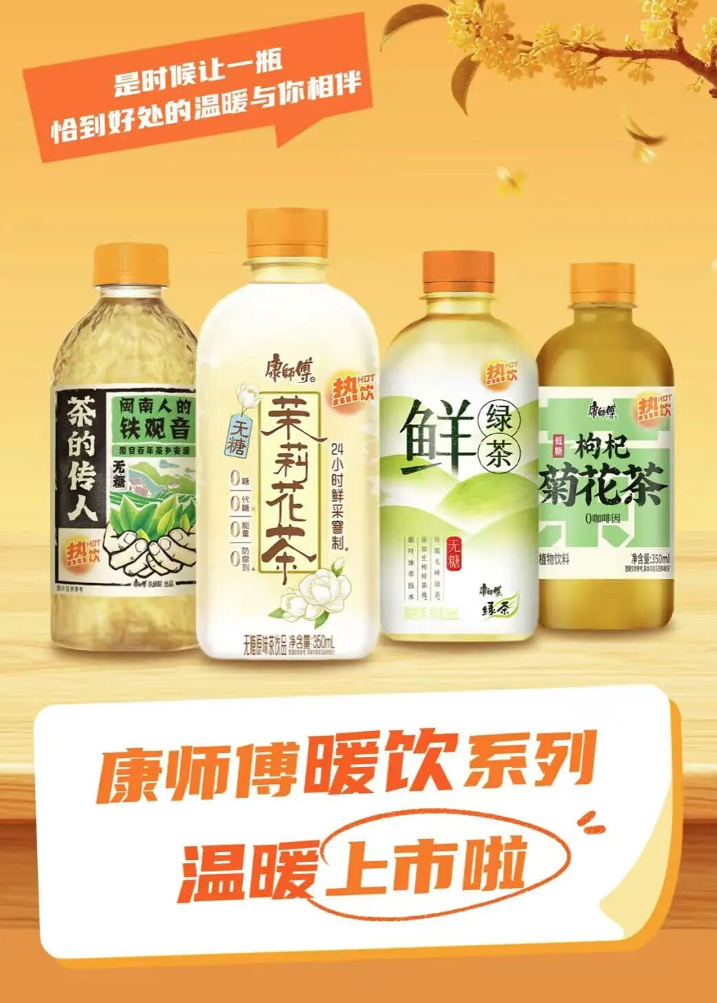 近日,康师傅推出了可加热的暖饮产品,分别为茉莉花茶、鲜绿茶、枸杞菊花茶、茶的传人的暖饮版,该系列饮品规格均为350ml小瓶装,握在手里轻巧无负担。目前,该系列产品已在便利店渠道上市。