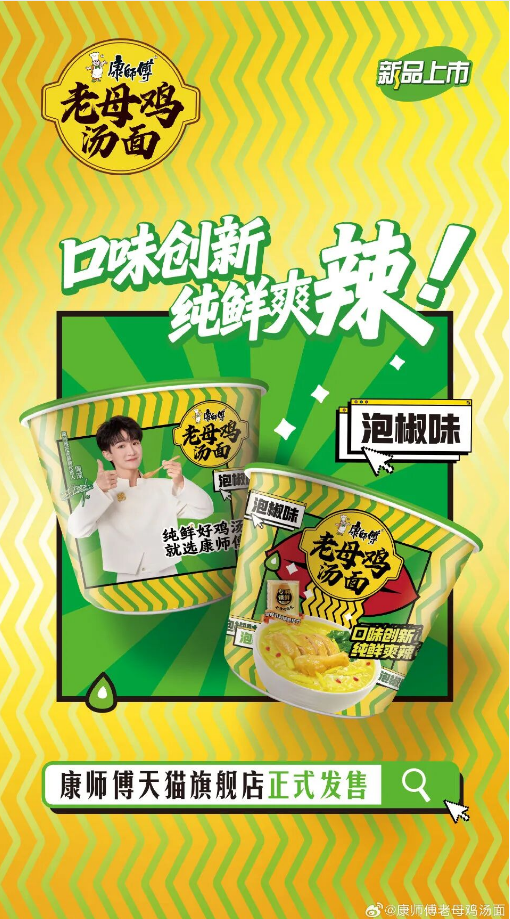近日,康师傅官方旗舰店上线一款新口味方便面——泡椒味老母鸡汤面。新品甄选地道云南小米椒自然发酵;精炖老母鸡汤酸爽鲜美,汤包锁鲜,充分留住鸡汤鲜纯;还加入虫草花、枸杞,健康有营养;采用6小时细熬、4段慢炖,还原家庭炖煮风味。