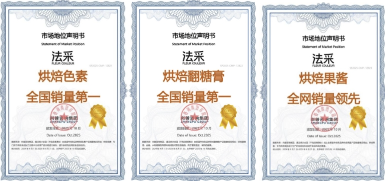 近期,尚普咨询集团向济南法采科技发展有限公司(以下简称“法采”)旗下品牌法采的烘焙色素、烘焙翻糖膏与烘焙果酱产品颁发市场地位声明。此次,经过严密的数据考证,尚普咨询集团确认向法采授予【法采 烘焙色素全国销量第一】【法采 烘焙翻糖膏全国销量第一】与【法采 烘焙果酱全网销量领先】权威声明。法采的烘焙色素、烘焙翻糖膏与烘焙果酱产凭借其现代化的生产和专业的产品,赢得了市场的广泛青睐。