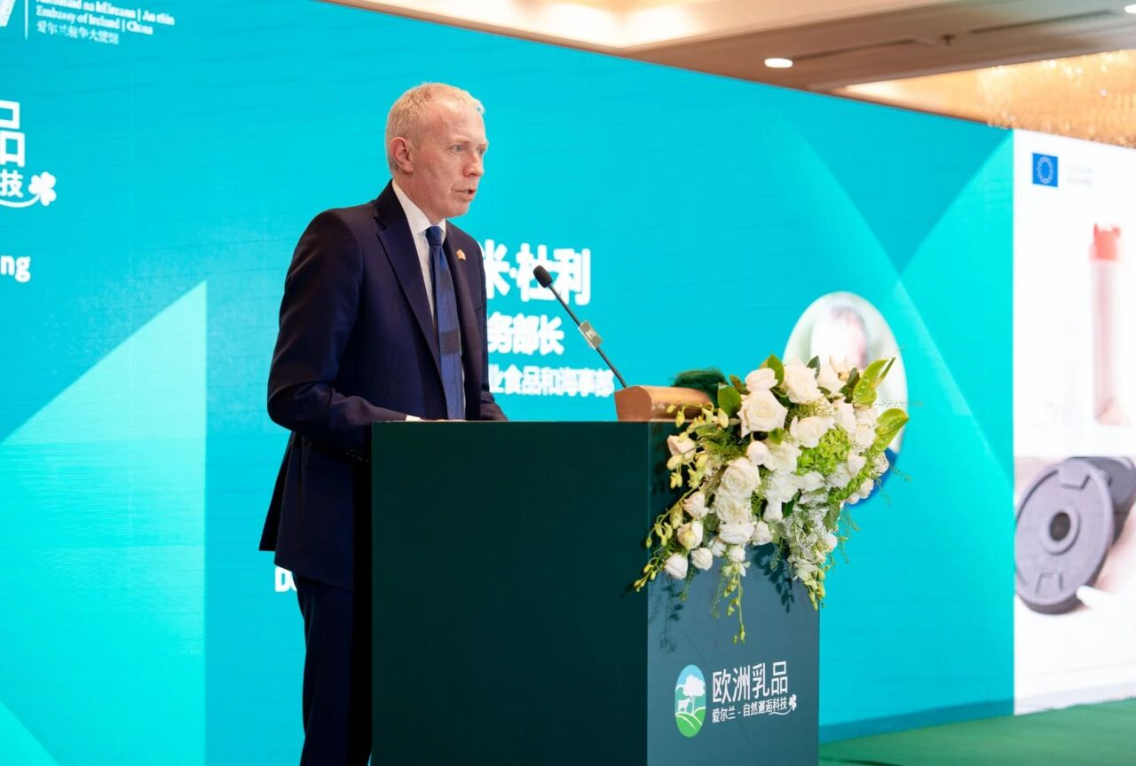 爱尔兰农业食品海事部国务部长迪米·杜利(Timmy Dooley T.D.)为乳品研讨会盛大揭幕。来自爱尔兰与中国的行业专家齐聚一堂,就欧洲优质乳品原料在中国强劲的市场增长需求及发展机遇展开了深入探讨。